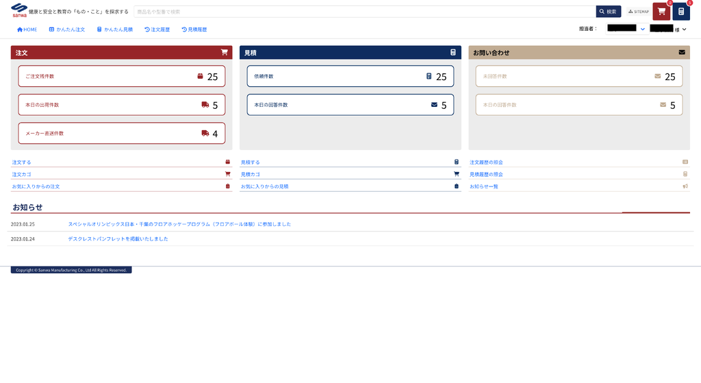 現在、三和製作所にご注文の商品、見積依頼の件数などのタスク件数を表示します。